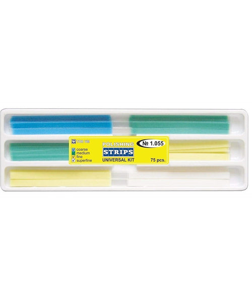 Abrasive Strips Kit for Interproximal Finishing and Gloss PolishingBlue and green - Gross reduction and contouringGreen and yellow- Contouring and polishingYellow and white- Polishing and Finishing CONTENT : 1 x75...