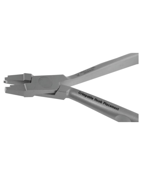 Crimpable hook placement plier is a dental tool used for fixing crimpable hook along archwire.
