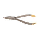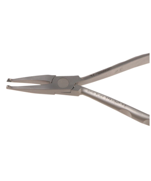 How plier is used for removal and placement of the archwires. It has round and serrated tips.