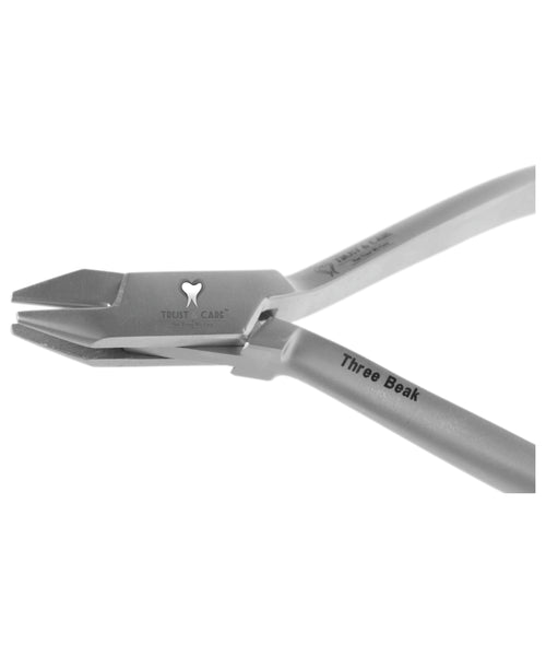Three prong orthodontic pliers are useful for grasping wires and clasps for intraoral archwire adjustments as well as for lingual arch adjustments. It can have a wide range of beak characteristics, and may be long and tapered for hard to reach quadrants or short and stubby for firmer control.